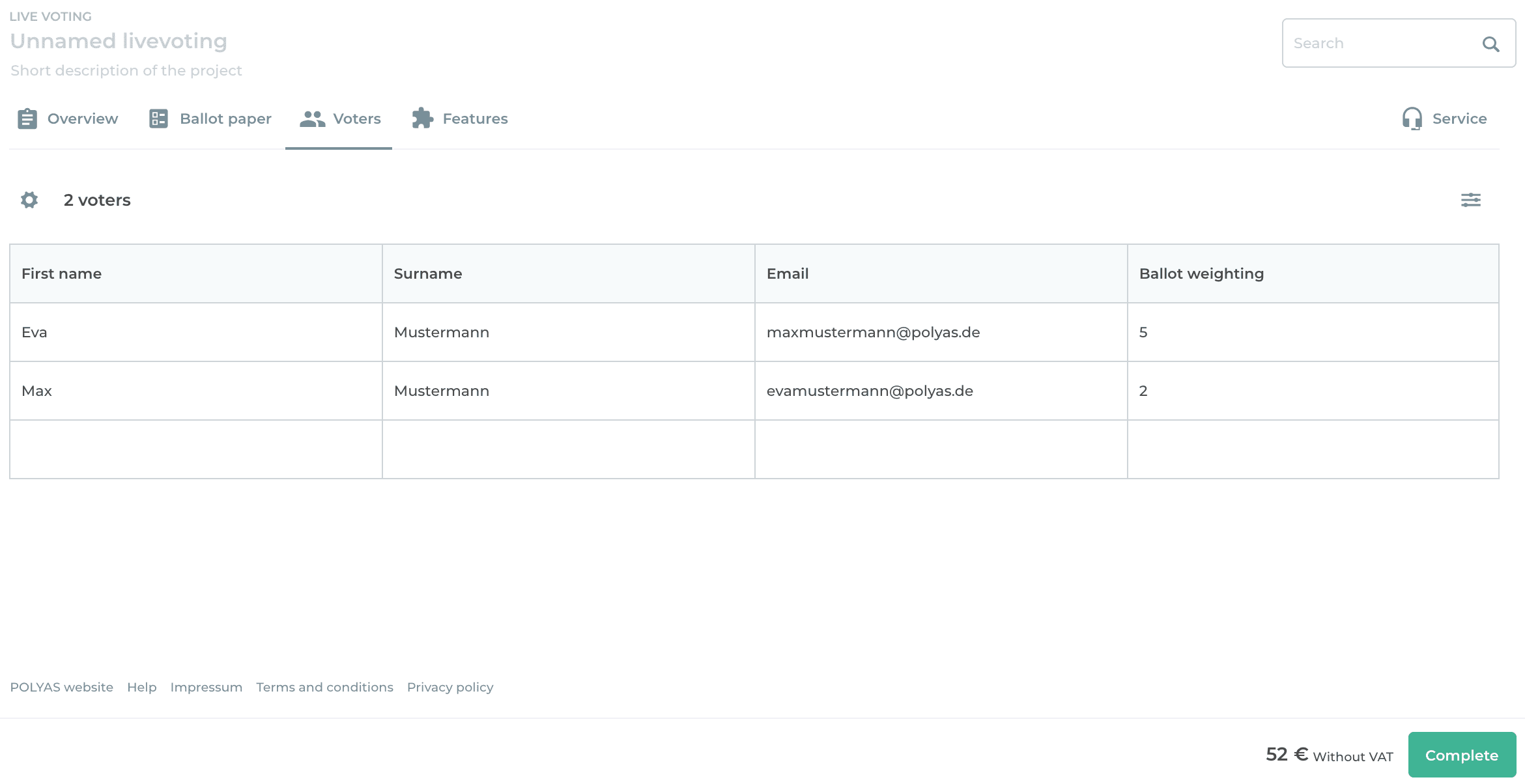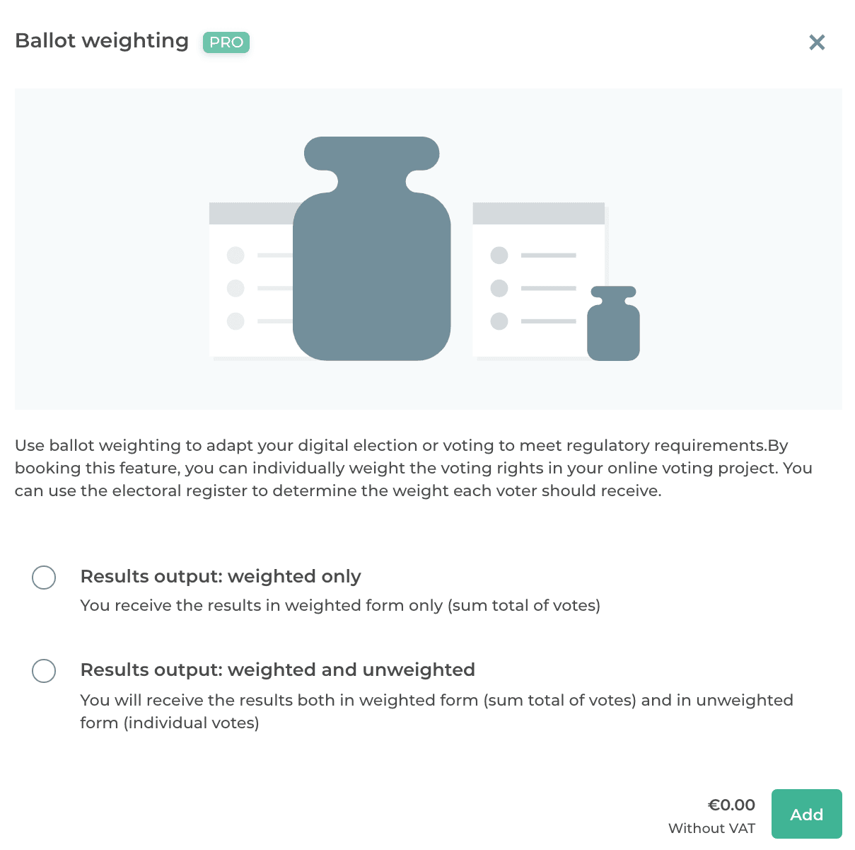 Ballot weighting can also be set up for online voting and elections. To do this, log in to the POLYAS Online Voting Manager and go to the “Features” tab. This is where you book the “Ballot Weighting” feature. Here you decide whether to output the weighted results of the voting only, or whether to provide the weighted and unweighted results.