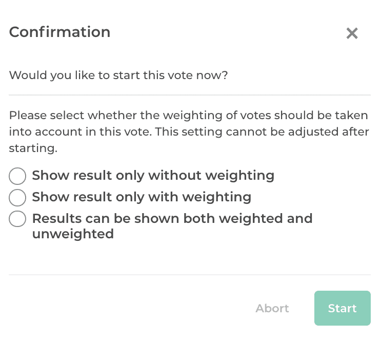 If you booked the feature with both the weighted and unweighted results, before you start the voting the Live Voting Cockpit allows you to decide again which type of analysis you would prefer.