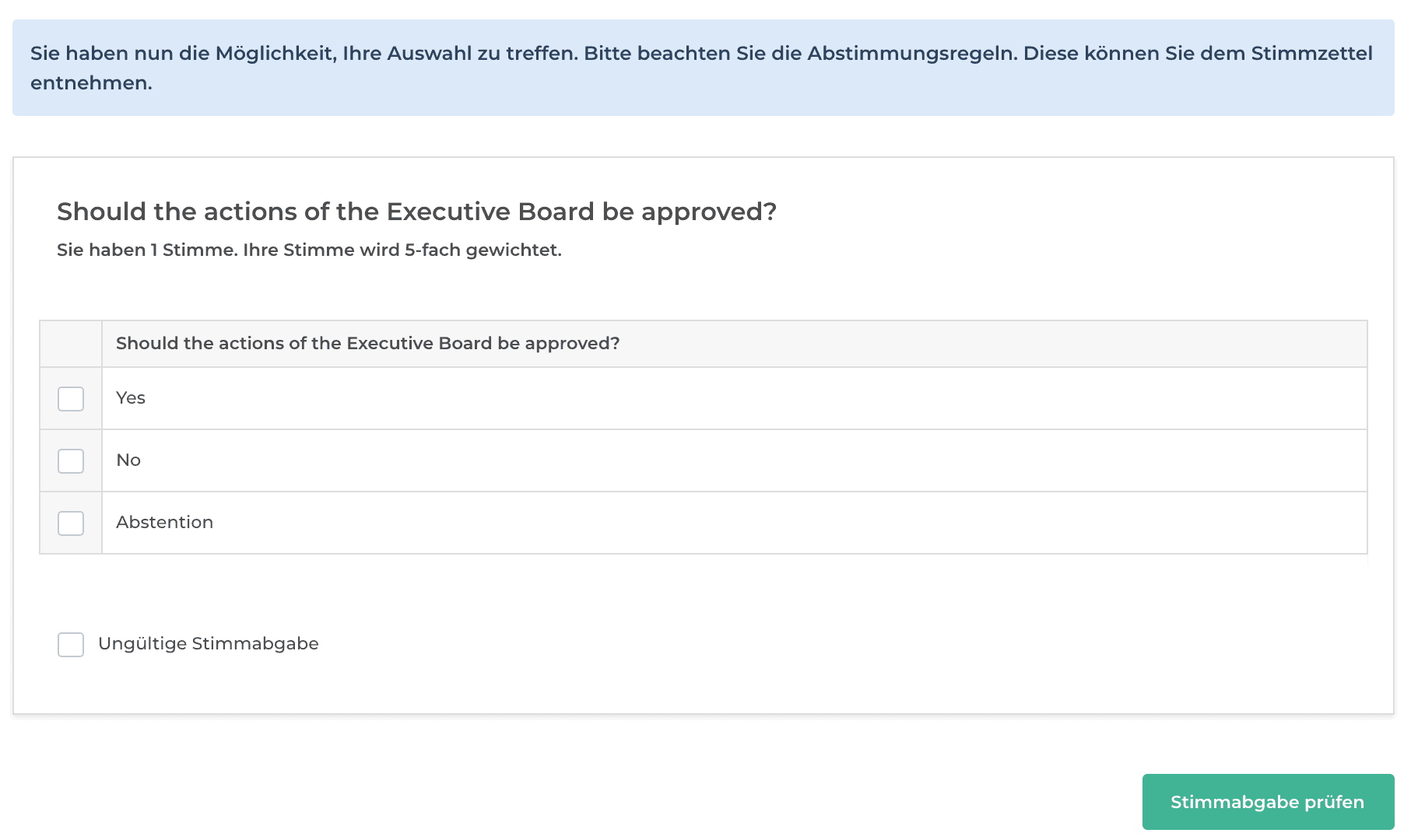Once you have started the voting with the POLYAS Live Voting Cockpit, voters are shown the factor used to weight their ballot.